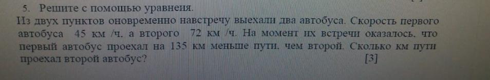 5.решите с помощью уравнения из двух пунктов одновременно навстречу выехали два автобуса. Скорость первого автобуса 45 км/ч. а второго 72 км/ч. На момент их встречи оказалось что первый автобус проехал на 145 км меньше пути, чем второй. Сколько км пути проехал второй автобус?