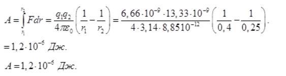 Два шарика с зарядами 6,7 нКл и 13,3 нКл находятся на расстоянии 40 см друг от друга. Вычислите работу, которую нужно совершить, чтобы сблизить их до расстояния 25 см.