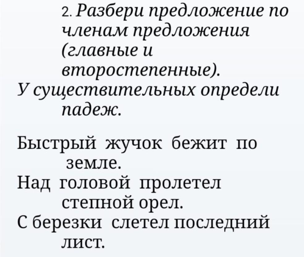 быстрый- определение, жучок- подлежащее, бежит- сказуемое, по земле - обстоятельство. над головой- обстоятельство, пролетел- сказуемое, степной-определение, орел- подлежащее. с березки- обстоятельство, слетел-сказуемое, последний-определение, лист- подлежащее. жучок-и.п , по земле - д.п над головой- т.п орел- и.п с березки р.п лист- и.п