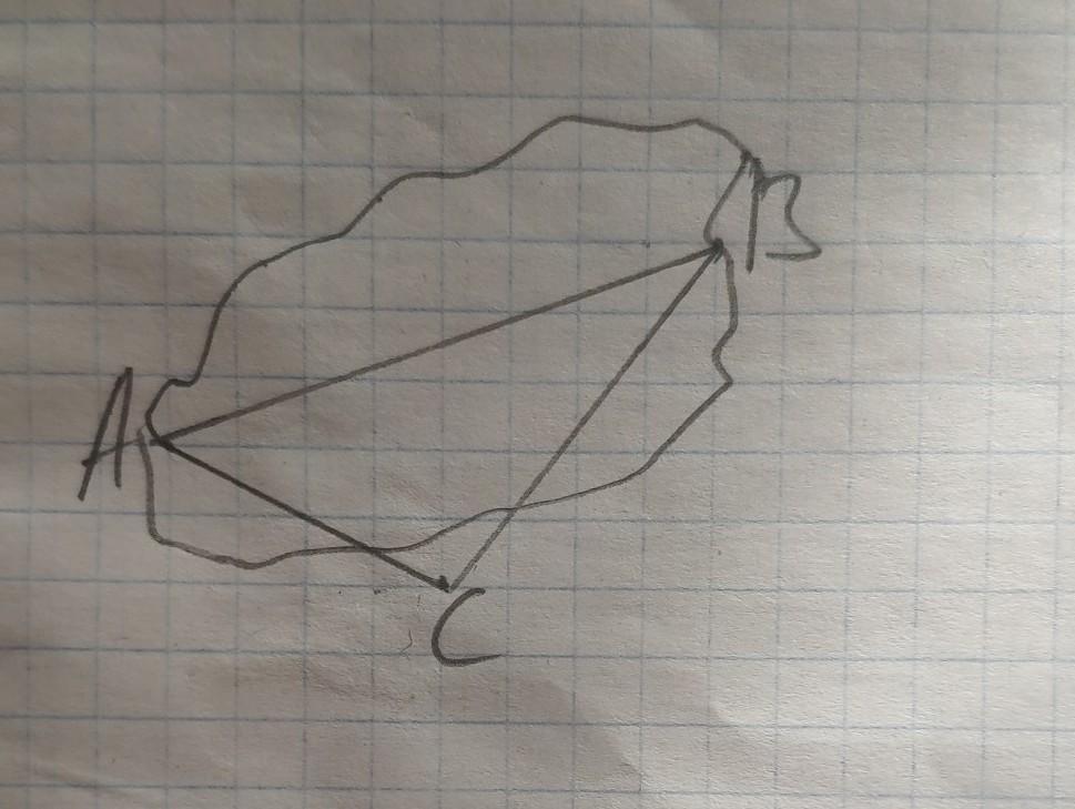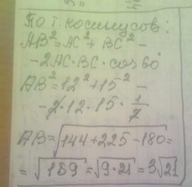 найдите ширину озера AB, если AC=12, угол C=60°, BC=15. В ответе укажите целое число метров.