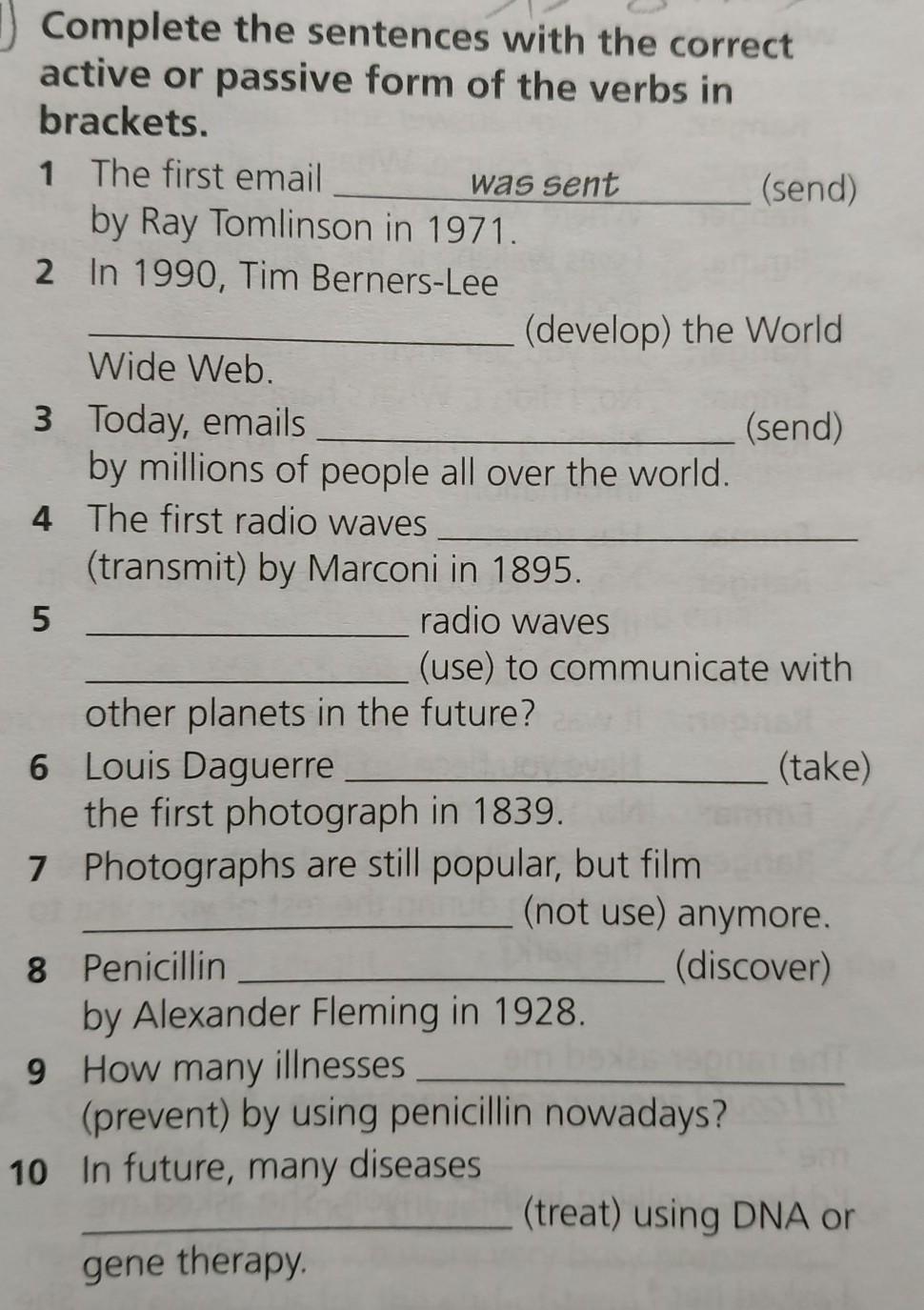 2 developed 3 are sent 4 were transmitted 5 Will …be used 6 took 7 isn’t used 8 was discovered 9 are prevented 10 will be treated