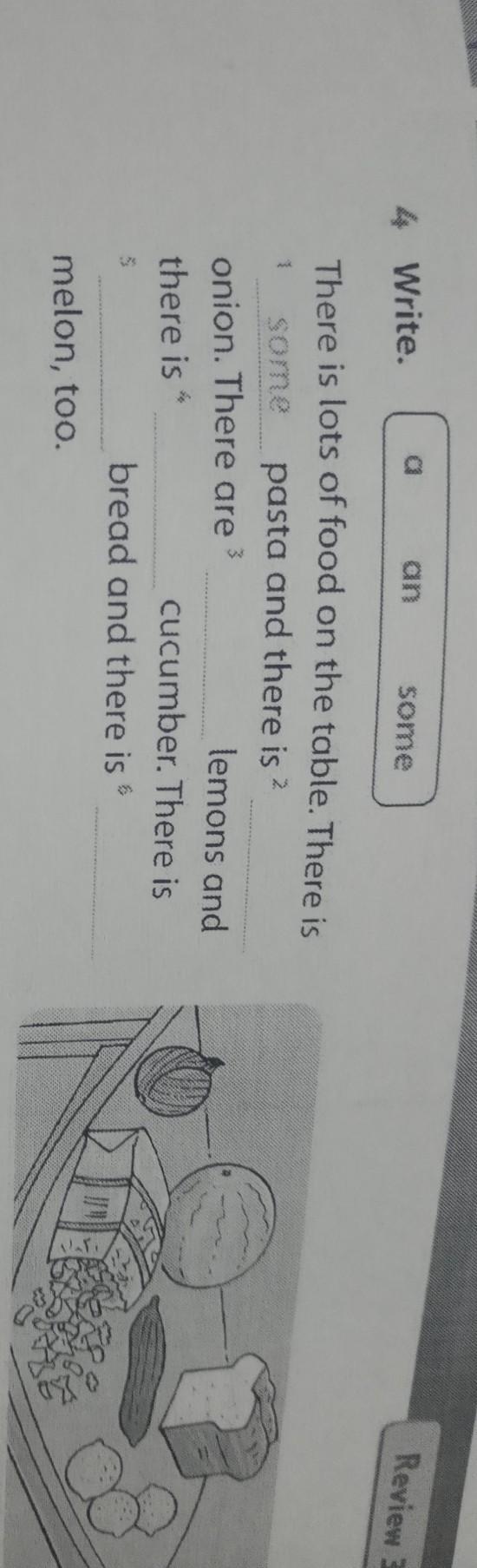 Tere is some psta and there is ___ onion.There are ___ lemons and there is ___ cucumber.Tere is ___ bread and there is ___ melon,too.