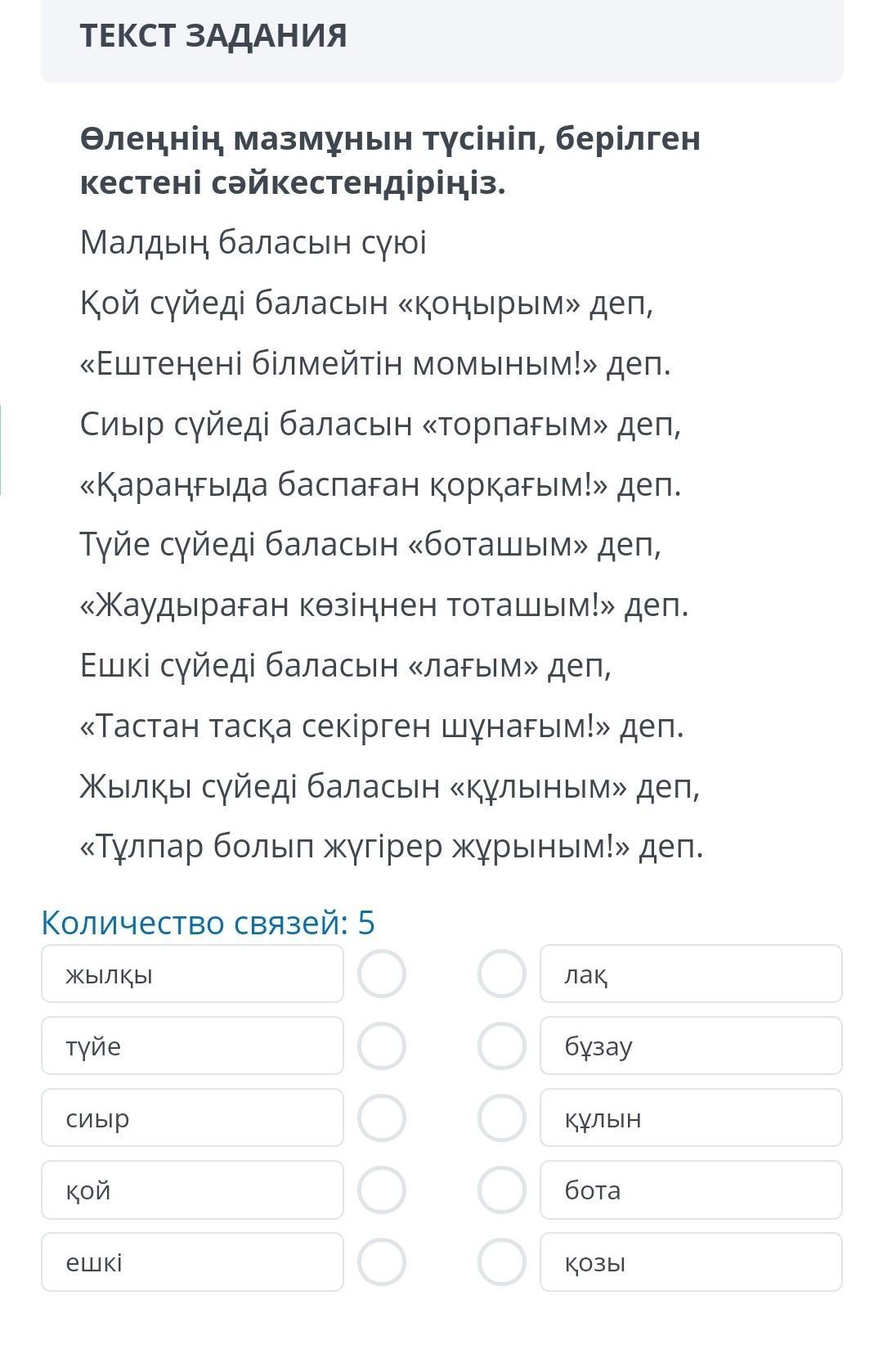жылкы- құлын. түйе- бота. сиыр - бұзау. қой- қозы. ешкі- лақ