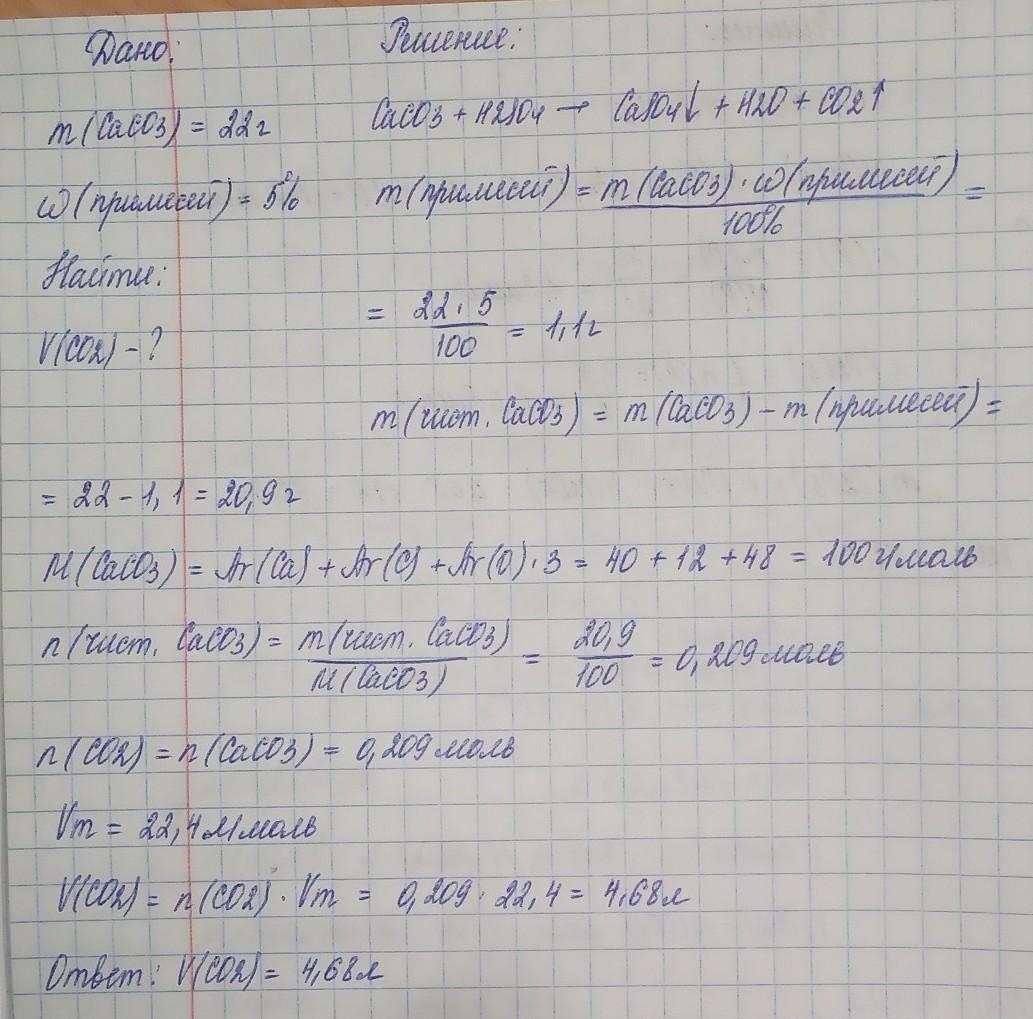 Найди объём углекислого газа (н. у.), который выделится при действии серной кислоты на 22 г мрамора, содержащего 5 % некарбонатных примесей