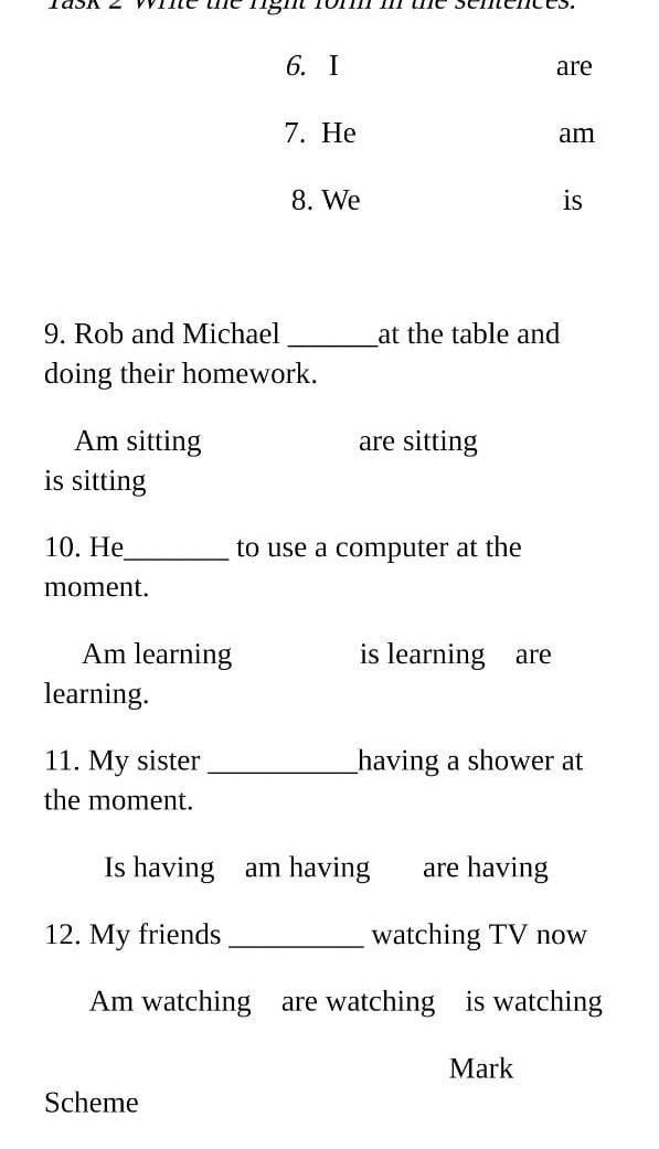 Task 2 Write the right form in the sentences. 6. I 7. He 8. We are am is 9. Rob and Michael doing their homework. Am sitting is sitting 10. He moment. Am learning learning. 11. My sister the moment. Is having 12. My friends Am watching Scheme at the table and are sitting to use a computer at the is learning _having a shower at am having are having watching TV now are watching is watching Mark are помогите пожалуйста дам 100 балов