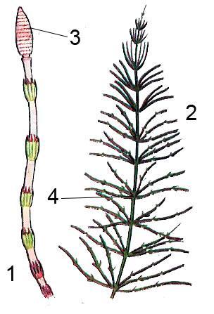 Строение полевого хвоща 1 — весенний (спороносный) побег; 2 — летний (вегетативный) побег; 3 — спороносный колосок (стробил); 4 — мутовка чешуевидных листьев.
