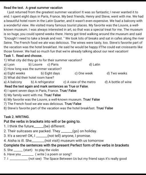 Task 2. WRITING. Put the verbs in brackets into will or be going to. 1. I think the future (be) different. 2. Their suitcases are packed. They (go) on holiday. 3. It's a secret! OK, I. (not tell) anyone, I promise. 4. Aisha is ill. She (not visit) museum with us tomorrow Complete the sentences with the present Perfect form of the verbs in brackets 5. She (start) to play the violin 6. Have you (write ) a poem or song? 7.1 (not see) The Space Between Us but my friend says it's really good