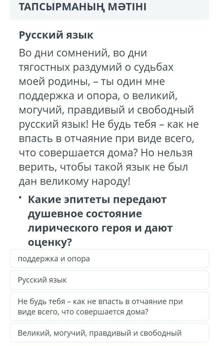 Во дни сомнений, во дни тягостных раздумий о судьбах моей родины, - ты один мне поддержка и опора, о великий, могучий, правдивый и свободный русский язык! Не будь тебя - как не впасть в отчаяние при виде всего, что совершается дома? Но нельзя верить, чтобы такой язык не был дан великому народу! Какие эпитеты передают душевное состояние лирического героя и дают оценку? поддержка и опора Русский язык Не будь тебя-как не впасть в отчаяние при виде всего, что совершается дома? Великий, могучий, правдивый и свободный