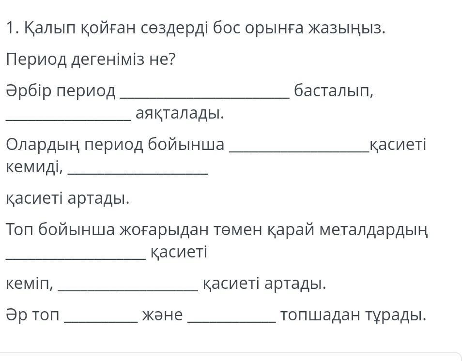 Ответ:Периодтық системаның периоды — электрондық қабықшаның саны бiрдей элементтердi жинақтайтын периодтық кестенiң жолы.Период деп сілтілік металдан басталып инертті газбен аяқталатын элементтер тобын айтады.