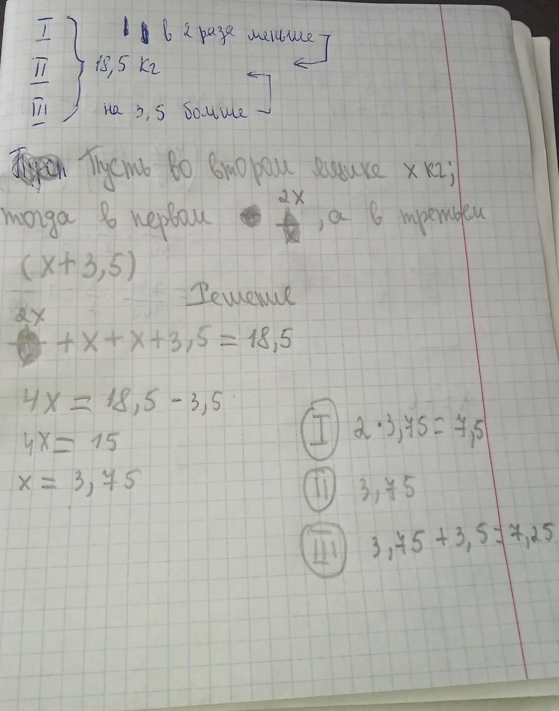 В магазин привезли три ящика слив общей массой 18,5 кг. В первом ящике в 2 раза меньше кг слив, чем во втором ящике. А в третьем ящике на 3,5 больше, чем во втором ящике. Сколько кг слив в каждом ящике.