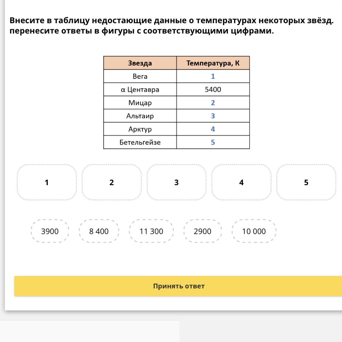 Внесите в таблицу недостающие данные о температурах некоторых звёзд. перенесите ответы в фигуры с соответствующими цифрами.
