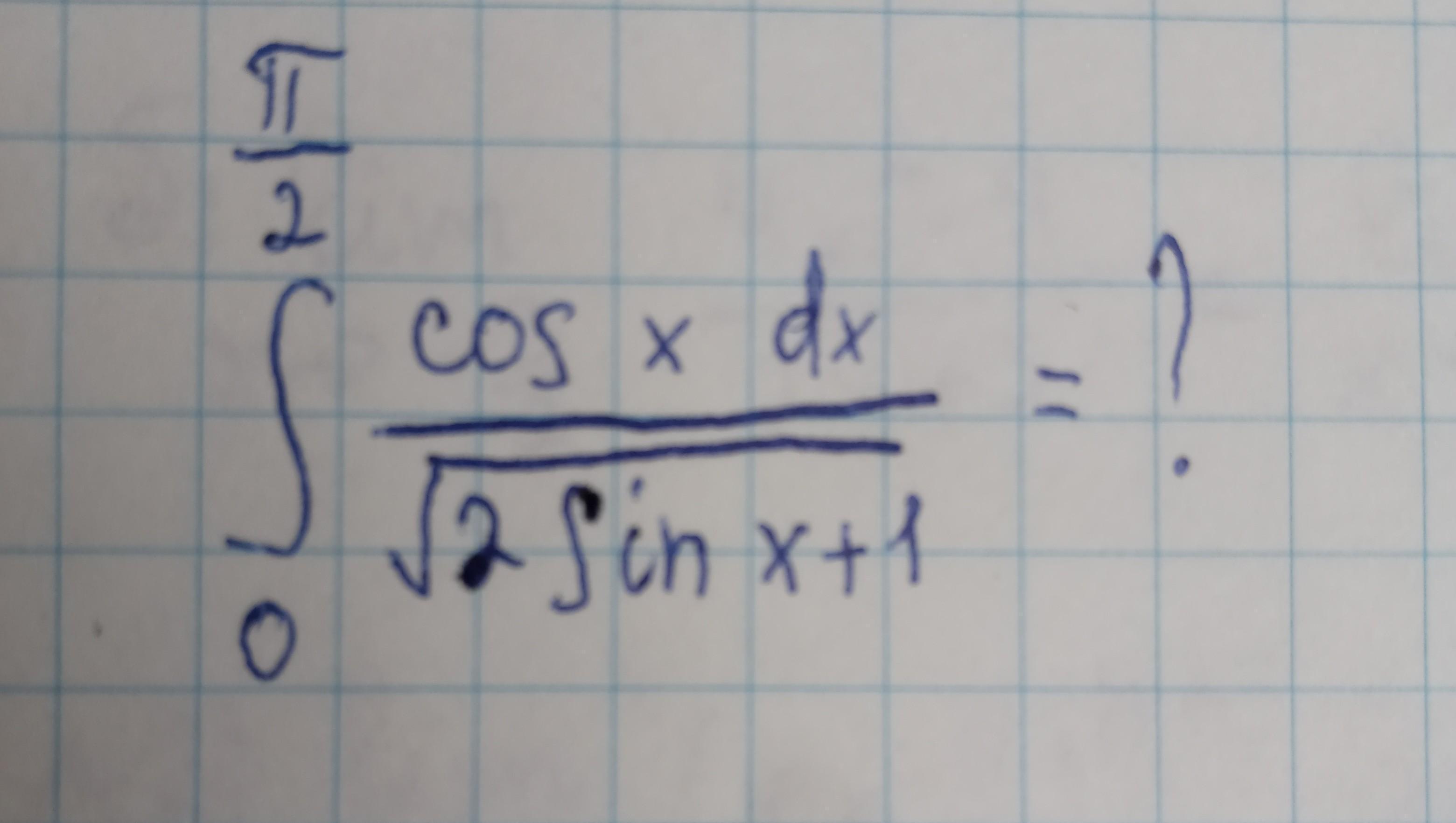 \int\limits^{  \frac{\pi}{2} } _ {0} \frac{ \cos(x) dx}{ \sqrt{2 \sin(x) + 1 } }  = \int\limits^{  \frac{\pi}{2}  } _ {0} \frac{d( \sin(x)) }{ \sqrt{2  \sin(x) + 1} } =  \\  =  \frac{1}{2}  \int\limits^{  \frac{\pi}{2}  } _ {0} \frac{d(2 \sin(x) + 1) }{ {(2 \sin(x) + 1) }^{ \frac{1}{2} } }  =  \frac{1}{2}  \times  \frac{ {(2 \sin(x) + 1) }^{ \frac{1}{2} } }{ \frac{1}{2} }  | ^{ \frac{\pi}{2} } _ {0} =  \\  =  \sqrt{2 \sin(x)  + 1} | ^{ \frac{\pi}{2} } _ {0} =  \sqrt{2 \sin( \frac{\pi}{2} ) + 1 }  -  \sqrt{2 \sin(0) + 1 }  =  \\  =  \sqrt{3}  - 1