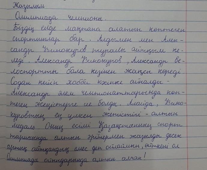 Бір күні кішкентай бауырыңыз сізден көмек сұрады. Оған пән мұғалімі «Олимпиада чемпионы» деген тақырыпқа ақпарат жазып келуді тапсырған. Сіз бауырыңызға көмек көрсету үшін қандай олимпиада чемпионы туралы ақпарат айтасыз? Ақпаратты жазыңыз.