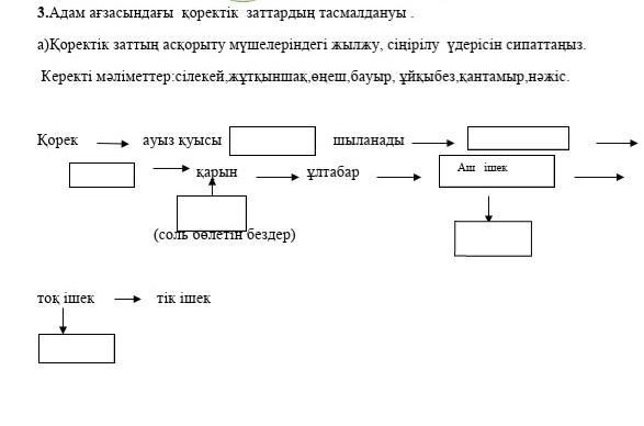 Қорек—ауыс қуысы—сілекей—шыланады—жұтқыншаң—өңеш—қарын—ұйқыбез—ұлтабар—аш ішек