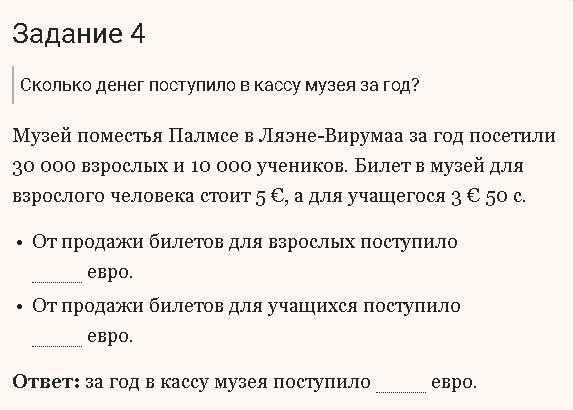 От продажи билетов для взрослых поступило 150 000 евро, так как взрослых людей было 30 000, а билет на одного взрослого стоит 5 евро, значит 30 000 * 5 = 150 000.