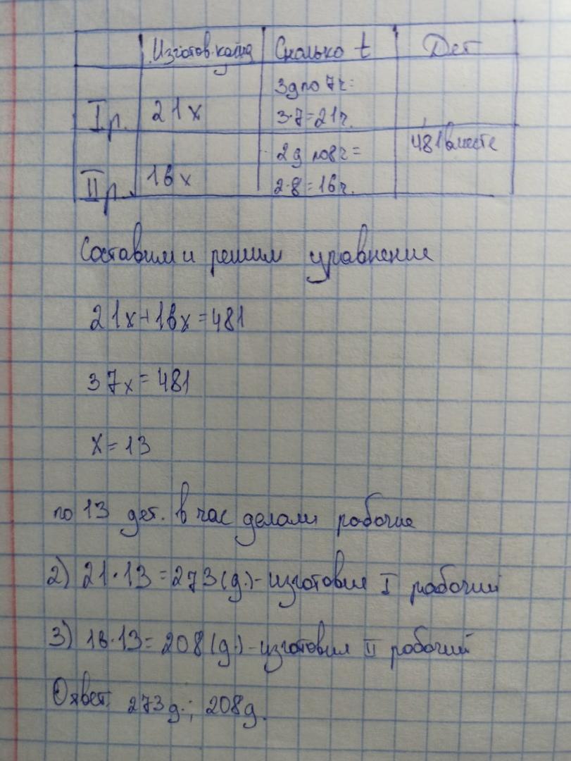 Один рабочий работал 3 дня по 7 ч в день, а другой — 2 дня по 8 ч в день. Вместе они изготовили 481 деталь. Сколько деталей изготовил каждый рабочий, если за час они изготовляли деталей поровну?