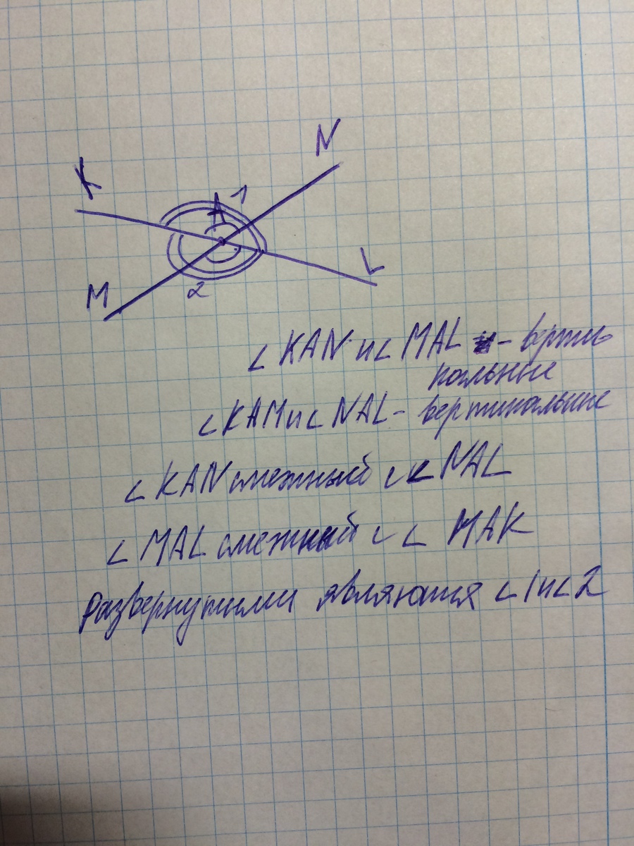 начертите две прямые MN и KL, пересекающиеся в точке А. Запишите названия всех углов, которые получились. Какие из них развернутые?