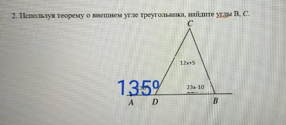 Теорема о внешнем угле треугольника такова: Внешний угол равен сумме 2 оставшихся углов, не смежных с ним, что и означает, что: <C + <B = 135°. =>