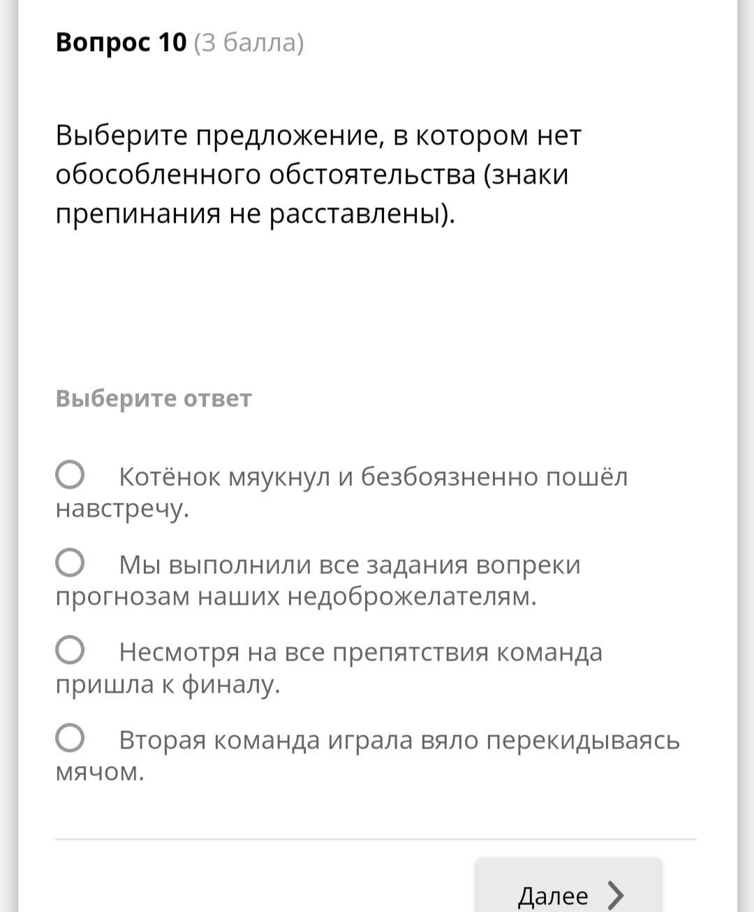 Вопрос 10. Не смотря на все препятствия, команда пришла к финалу.