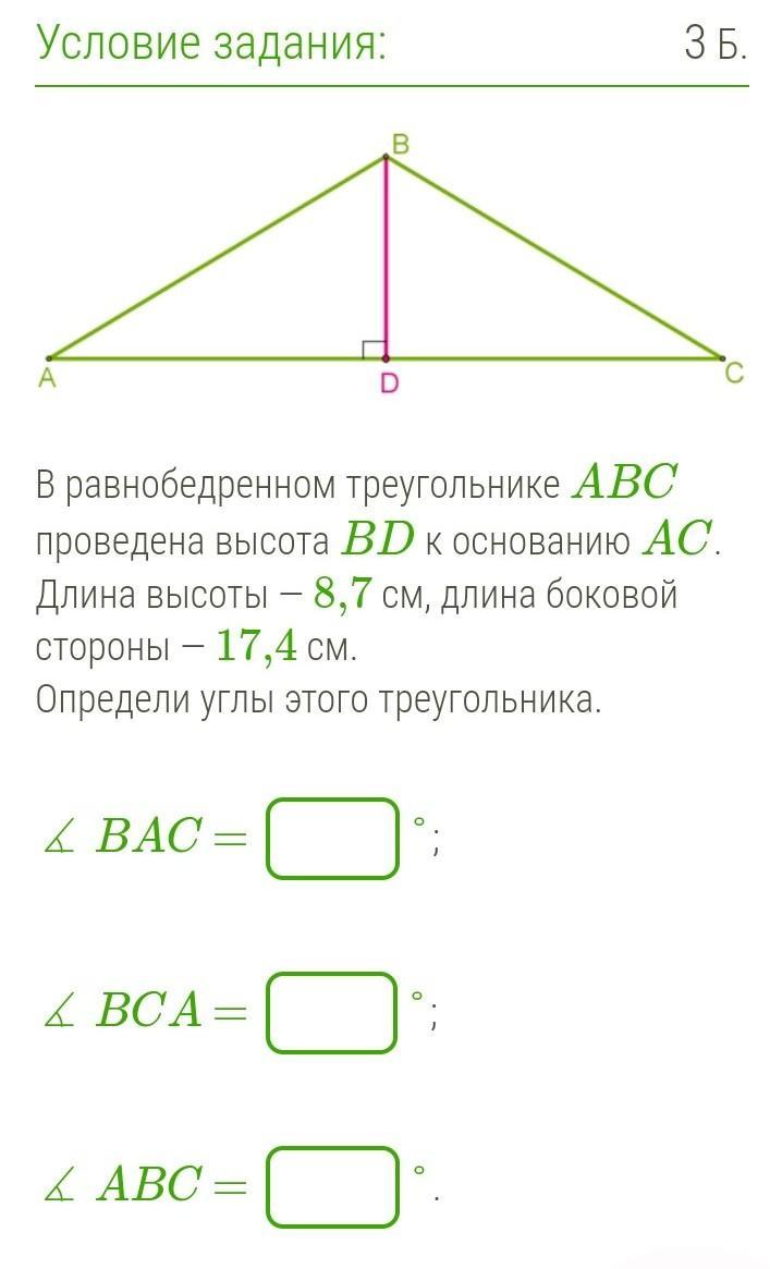 Объяснение: Проведенная высота является и катетом прямоугольных треугольников АBD и BDC. Угол А=углу С и равны арксинусу этих углов. Синус этих углов равен частному от деления высоты ВD на гипотенузу АВ и равен: sin А = 8,7 : 17,4 = 0,5. Значит угол А и угол С равны арксинусу 0,5 и равны по 30°. Угол В равен разности 180° и углов А и С и равен: 180-30-30=120°.