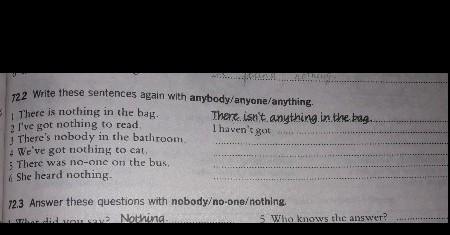 2. I haven't got anything to read. 3. There is not anybody in the bathroom. 4. We haven't got anything to cat. 5. There wasn't anybody on the bus. 6. She wasn't to hear anything.