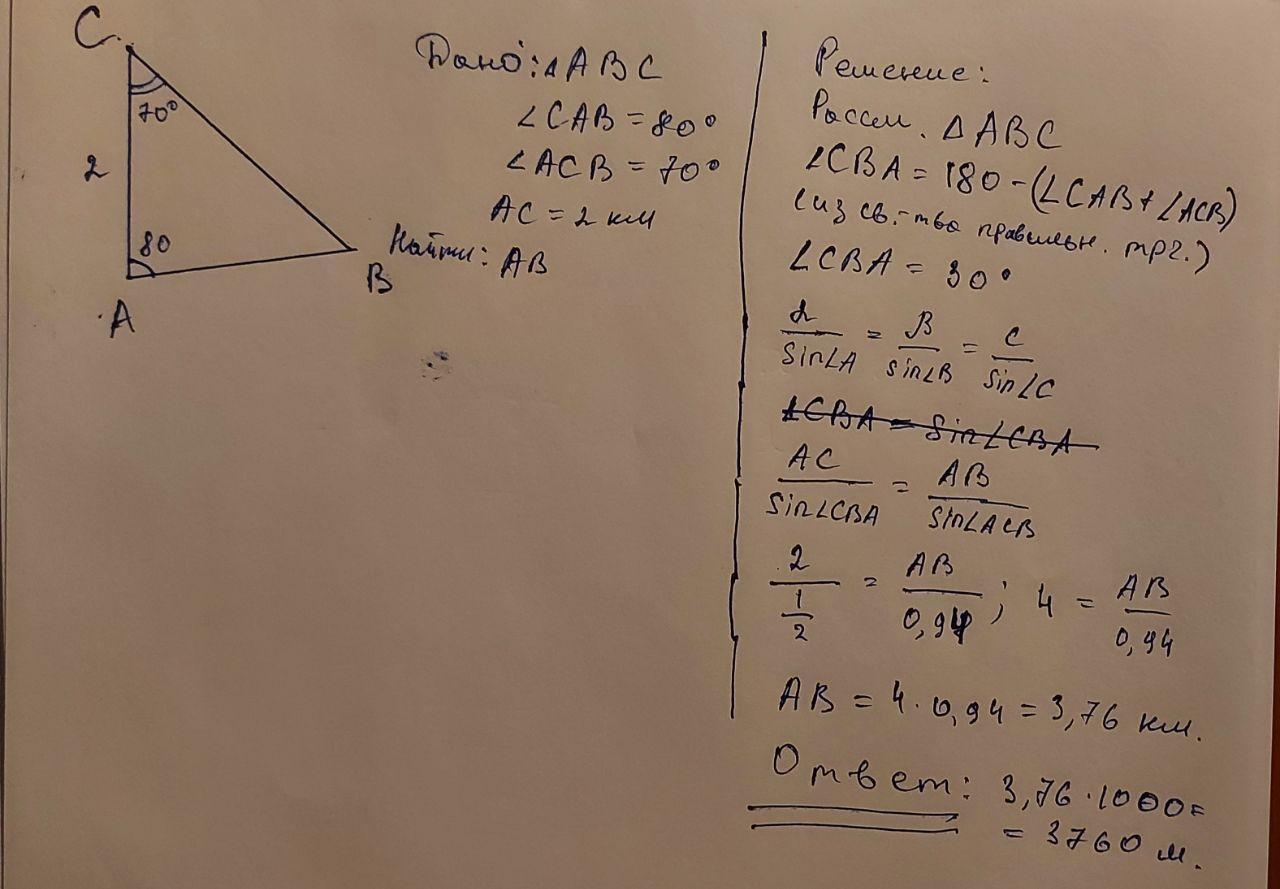 Найдите расстояние между населенными пунктами А и В, расположенными на разных берегах реки, если расстояние между пунктами А и С, расположенными на одном берегу этой реки равно 2 км, угол САВ равен 80°, угол АСВ равен 70° ( sin70°≈0,94; sin80°≈0,98). В ответе укажите целое число метров. [3]