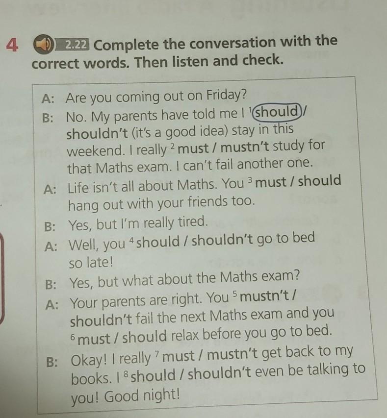 A: Your parents are right. You 5) mustn't fail the next Maths exam and you 6) should relax before you go to bed.