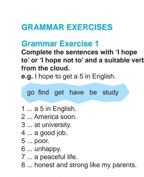 1. I hope to get a 5 in English. 2. I hope to go America soon. 3. I hope to study at university. 4. I hope to find a good job. 5. I hope not to be poor. 6. I hope not to be unhappy. 7. I hope to have a peaceful life. 8. I hope to be honest and strong like my parents.
