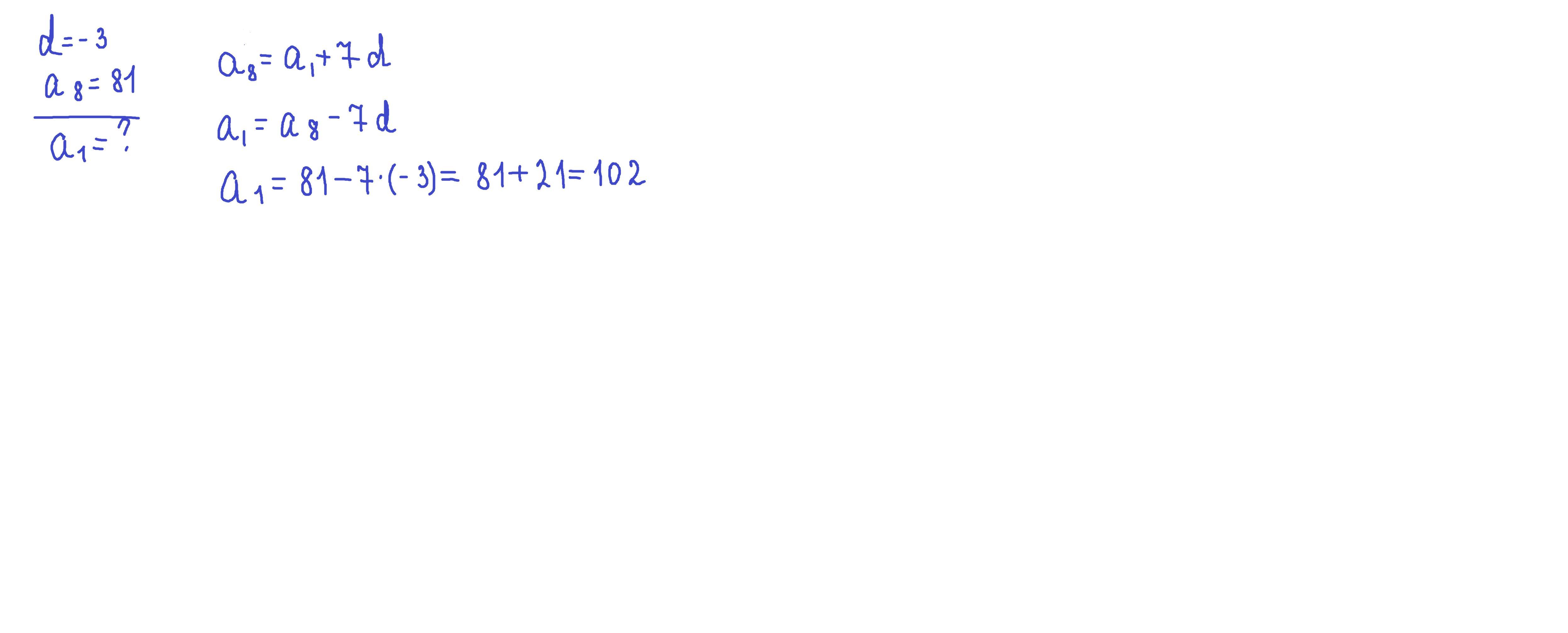 a₁ = a₈ - 7d = 81 - 7 * (- 3) = 81 + 21 = 102
