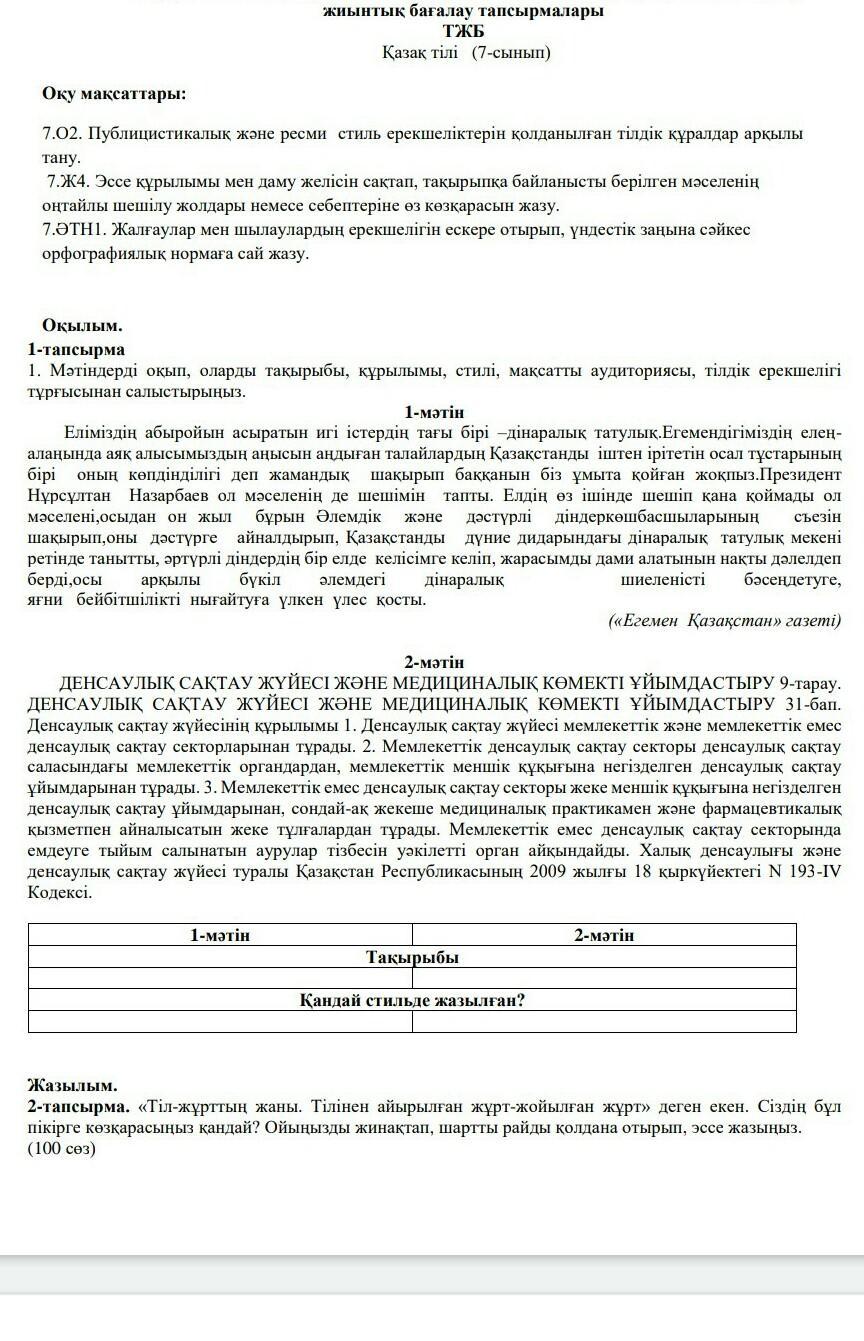 1. Мәтіндерді оқып, оларды тақырыбы, құрылымы, стилі, мақсатты аудиториясы, тілдік ерекшелігі