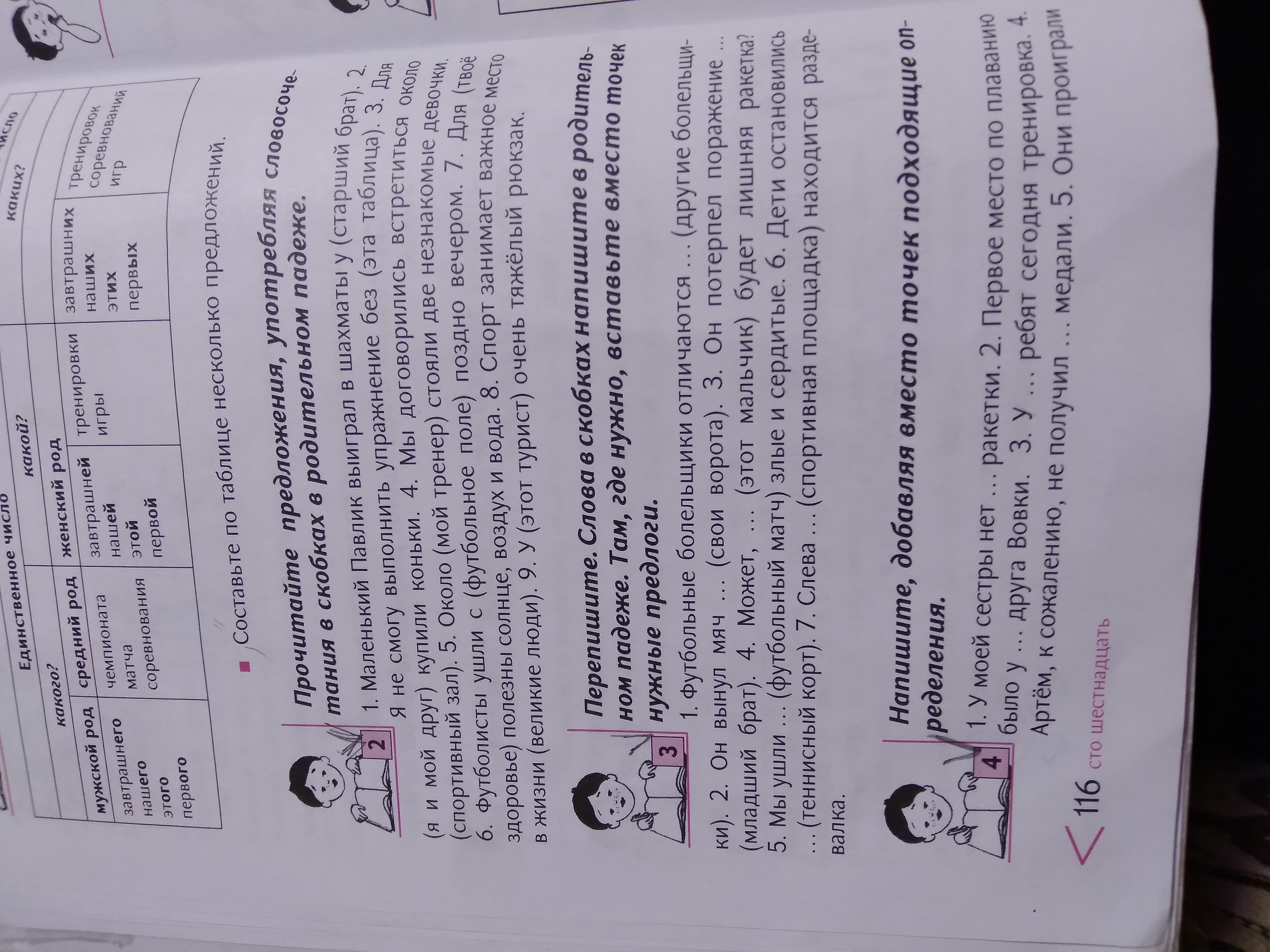 Маленький Павлик выиграл в шахматы у старшего брата. Я не смогу выполнить упражнение без этой таблицы. Для меня и моего друга купили коньки. Мы договорились встретиться около спортивного зала. Около моего тренера стояли две незнакомые девочки. Футболисты ушли с футбольного поля поздно вечером. Для твоего здоровья полезны солнце, воздух и вода. Спорт занимает важное место в жизни великих людей. У этого туриста очень тяжёлый рюкзак.