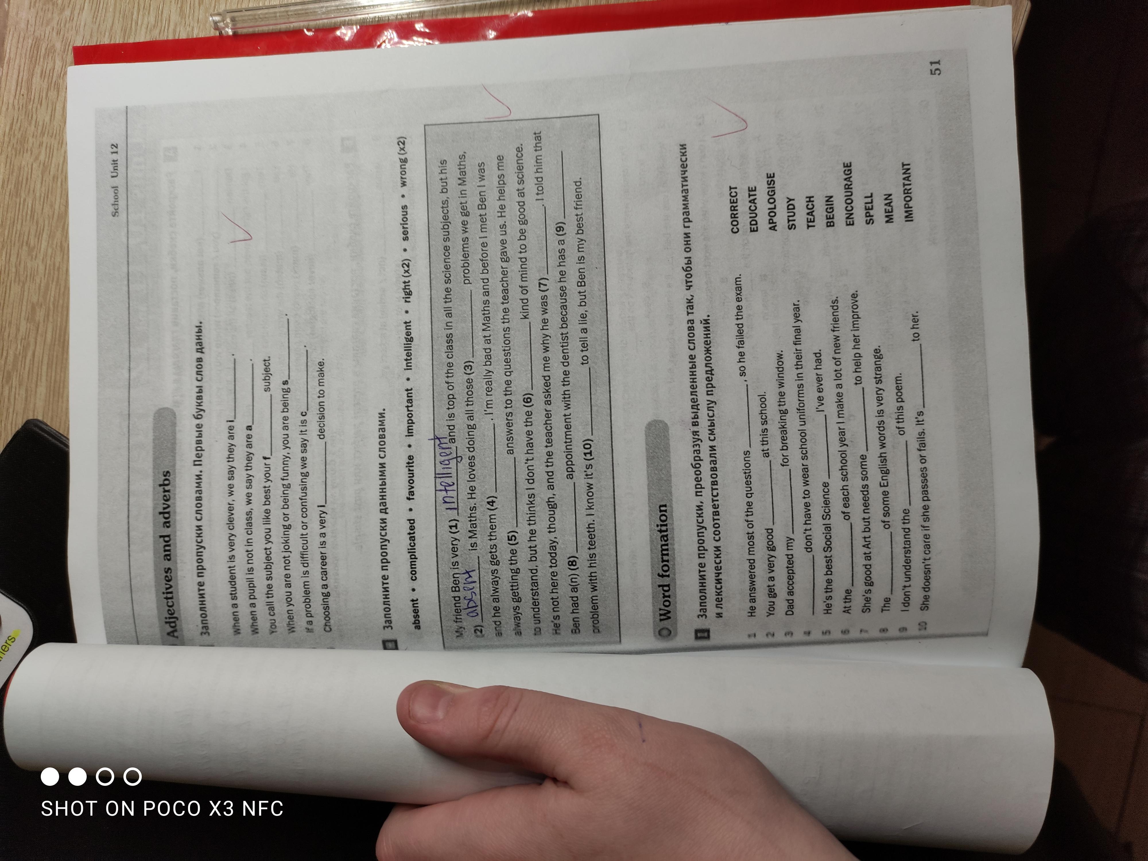 во втором: intelligent, favourite, complicated, right, wrong, right, absent, important, serious, wrong