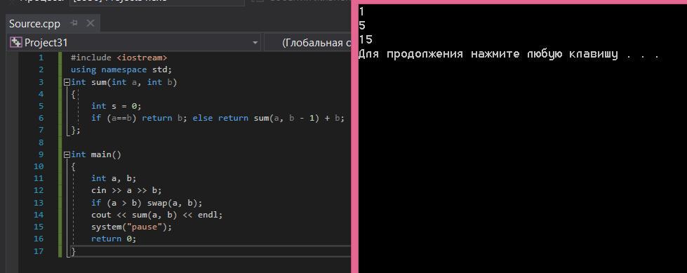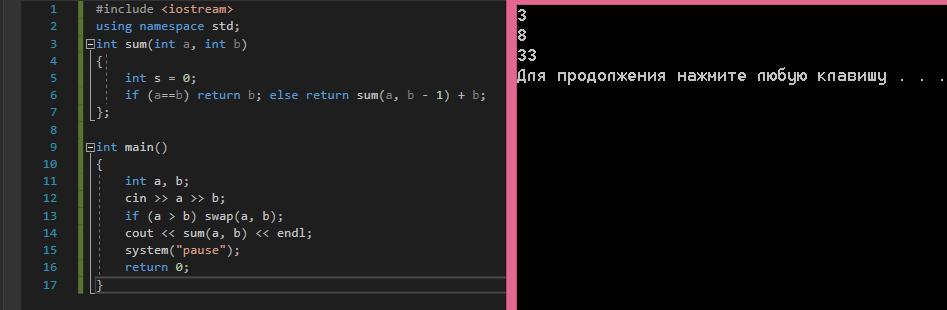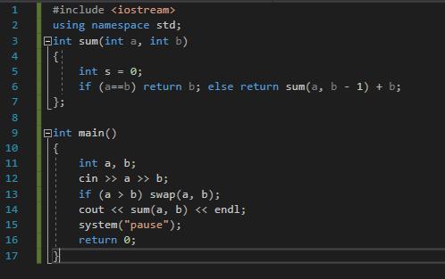 Дано два целые числа a и b. Напишите рекурсивную функцию для нахождения суммы всех чисел от a до b включительно.