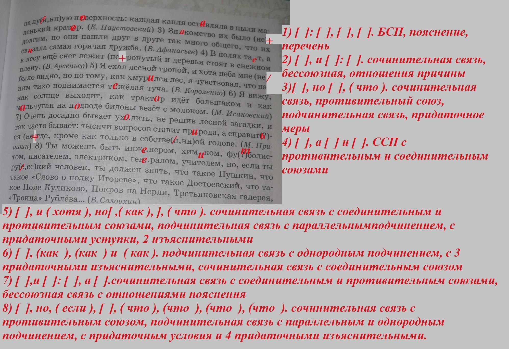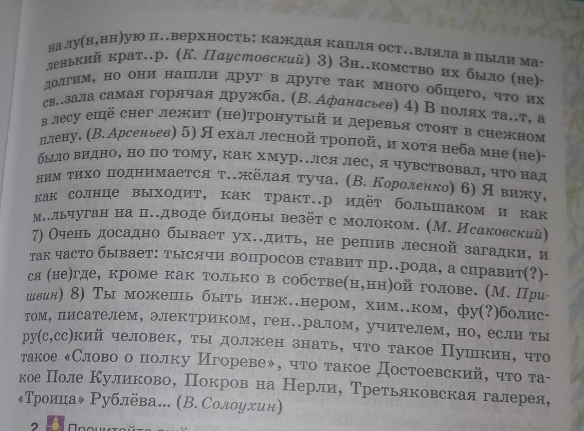 269,1. Запишите, раскрывая скобки и вставляя пропущенные бук- вы. Составьте схемы предложений, объясняя постановку знаков препи- нания. 1) Скво.ь постоя (н, нн) ый шум ветра чудились мне (не) вда- леке слабые звуки: т.пор осторожжно стучал по сучьям, коле- ca скр..пели, лошади фыркали. (И. Тургенев) 2) Крупные капли дождя падали на пыльную дорогу, и (в) скоре она стала п..хожа на лу (в, нн) ую п.верхность: каждая капля ост.вляла в пыли ма- ький крат..р. (К. Паустовский) 3) Зн..комство их было (не) - м. но они нашли друг в друге так много общего, что их лаская самая горячая дружба. (В. Афанасьев) 4) В полях та.т, а песу лежит снег (неутронутый и деревья стоят в снежном ену. (В. Арсеньев) 5) Я exal лесной тропой, и хотя неба мнe (не) - было видно, но по тому, как хмуУр..лся лес, я чувствовал, что над ним тихо поднимается т..желая туча. (В. Короленко) 6) Я вижу, как солнце выходит, как тракт.р идёт большаком и как M..Льчуган на п..дводе бидоны везёт с молоком. (М. Исаковский) 7 Очень досадно бывает ух.дить, не решив лесной загадки, и так часто бывает: тысячи вопросов ставит пр..рода, а справит (?) - ся (не) где, кроме как только в собстве (н , нн) ой голове. (М. При- швин) 8) Ты можешь быть инж..нером, хим..ком, фу (?) Болис- том, писателем, электриком, ген..ралом, учителем, но, если ты ру (с, cc ) кий человек, ты должен знать, что такое Пушкин, что такое «Слово о полку Игореве», что такое Достоевский, что та- кое Поле Куликово, Покров на Нерли, Третьяковская галерея, «Троица» Рублёва .. (В. Солоухин)