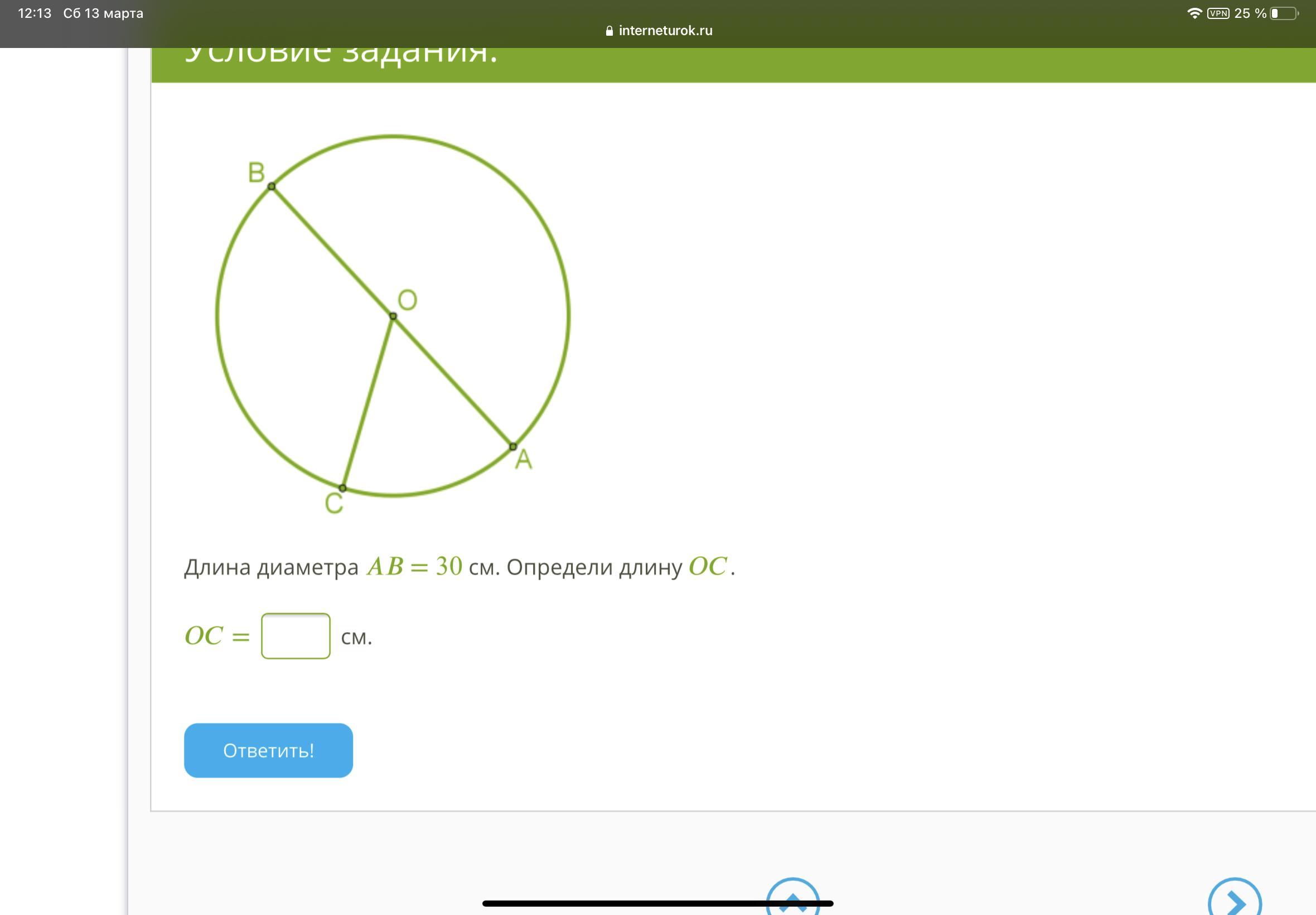 ОС = АВ : 2 = 30 : 2 = 15 (см)