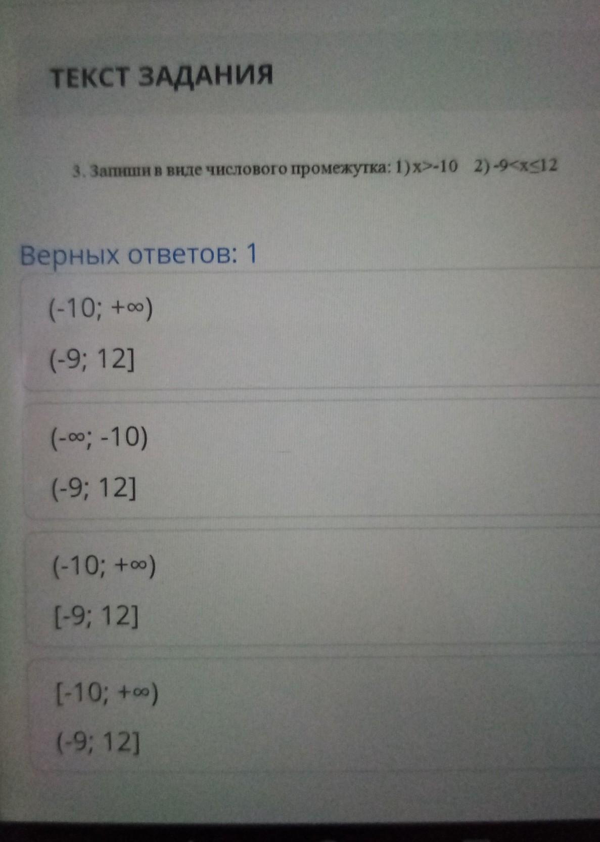 3. Запиши в виде числового промежутка: 1)x>-10 2) -9<x<12