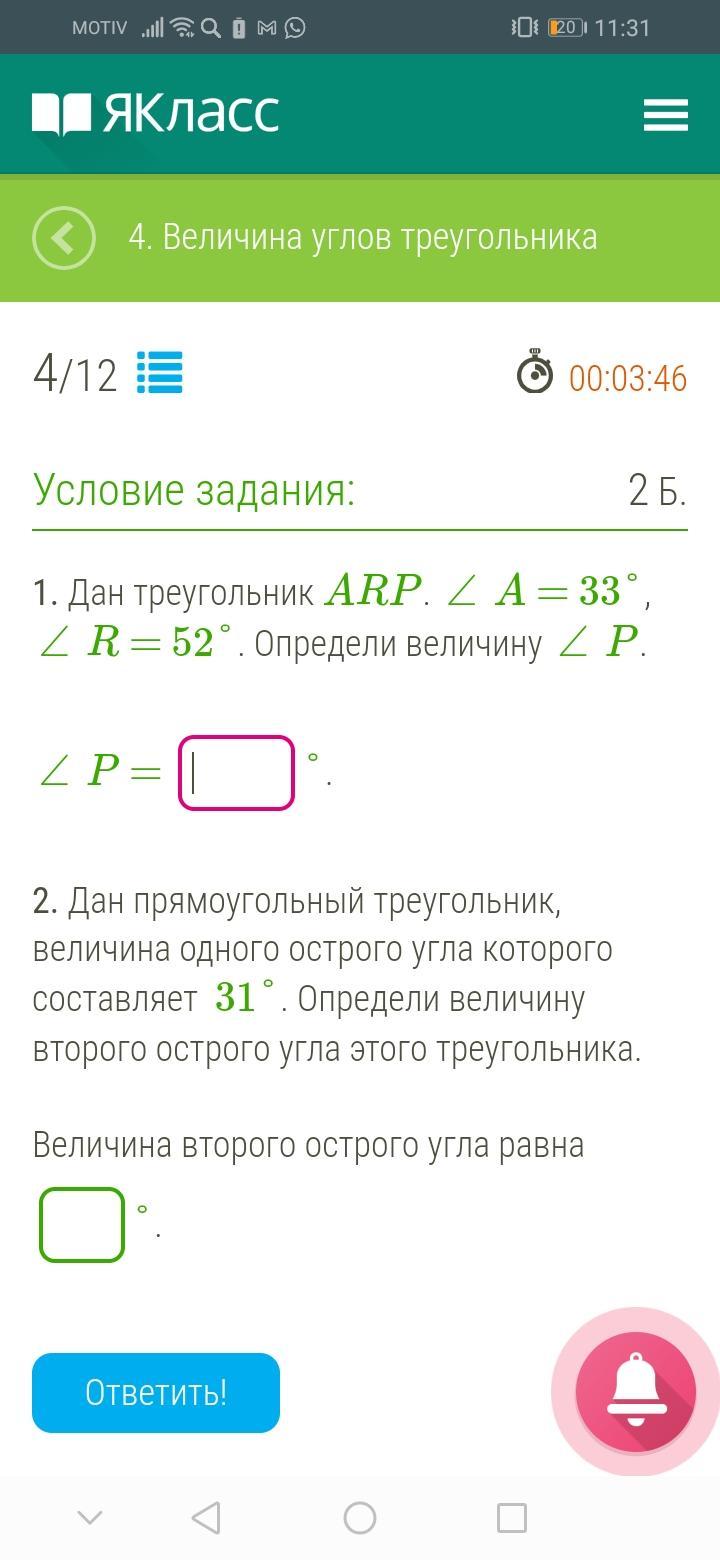 1. Дан треугольник ARP. ∠ A = 33°, ∠ R = 52°. Определи величину ∠ P. ∠ P = °. 2. Дан прямоугольный треугольник, величина одного острого угла которого составляет 31°. Определи величину второго острого угла этого треугольника. Величина второго острого угла равна °.