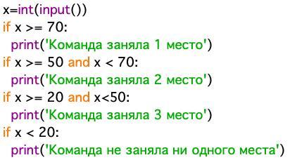 Известно, что команда,которая наберёт 70 баллов и выше занимает 1 место. Команда, которая набрала 50 баллов и выше-2 место и команда, которая набрала 20 баллов и выше 3 место. Ниже 20 баллов- место не предусмотрено.