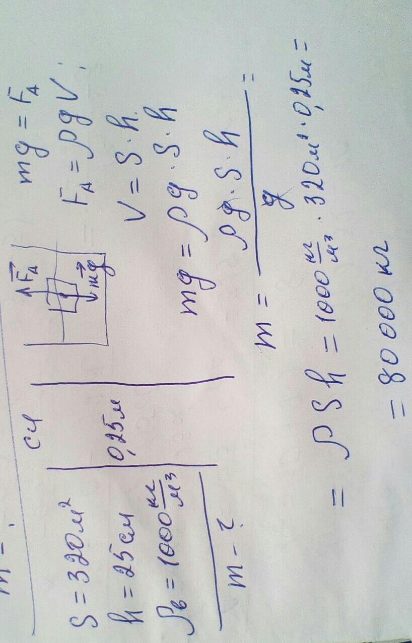 Плот площадью 320 м² после загрузки осел на 25см. Найди массу груза, помещённого на плот.