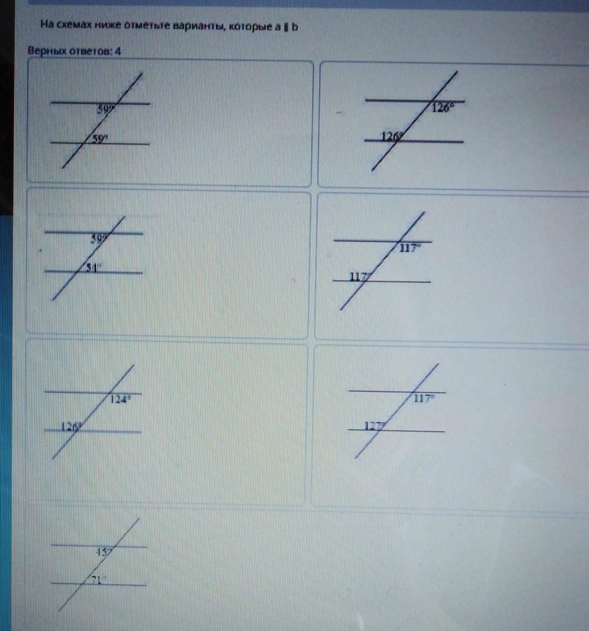 Отметь рисунки те, где эти углы одной градусной меры: 59/59; 126/126; 117/117;