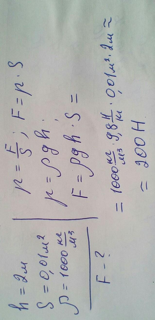 яку силу потрібно прикласти, щоб витягнути з дна басейну пробку, якщо глибина басейну 2м, а площа пробки 0.01м2