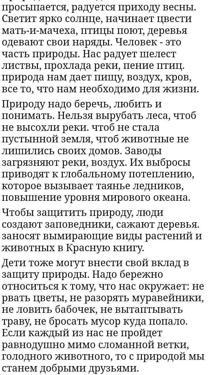 Ответ:оянады, көктемнің келгеніне қуанады. Күн жарқырайды, анасы мен өгей шешесі гүлдей бастайды, Құстар ән салады, ағаштар өз киімдерін киеді. Адам - табиғаттың бір бөлігі. Бізді жапырақтың сыбдыры, өзеннің салқыны, құстардың сайрағаны қуантады. табиғат бізге тамақ, ауа, баспана, өмірге қажет нәрсенің бәрін береді. Табиғатты қорғау керек, оны жақсы көру және түсіну керек. Өзендерің құрғап қалмас үшін, жерің қаңырап қалмас үшін, жануарлар үйлеріңді жоғалтпас үшін ормандарды кесуге болмайды. Зауыттар өзендерді, ауаны ластайды. Олардың шығарындылары жаһандық жылынуға алып келеді, бұл мұздықтардың еруіне, теңіз деңгейінің көтерілуіне әкеледі. Табиғатты қорғау үшін адамдар қорықтар жасайды, ағаш отырғызады. жойылып бара жатқан өсімдіктер мен жануарлардың түрлері Қызыл кітапқа енгізілген. Балалар табиғатты қорғауға өз үлестерін қоса алады. Біз айналамызға ұқыпты қарауымыз керек: гүл термеңіз, құмырсқалар өлтірмеңіз, көбелектерді ауламаңыз, шөпті таптамаңыз, қоқысты кез-келген жерге тастамаңыз. Егер әрқайсымыз сынған бұтақтың, аш жануардың жанынан бей-жай өтпесек, онда біз табиғатпен жақсы дос боламыз.