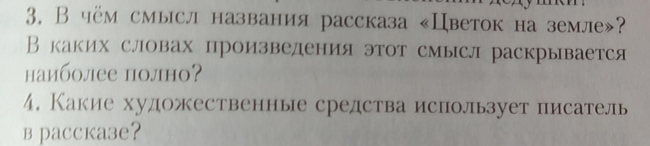 Цветок на земле - это каждый человек этого мира. Рассказами о цветах дедушка проводит аналогию с человеческой жизнью, в которой все имеет цикличность. Образом цветка, прорастающего из цветка, писать наводит читателя на мысль о том, что созидание - главная цель живого существа