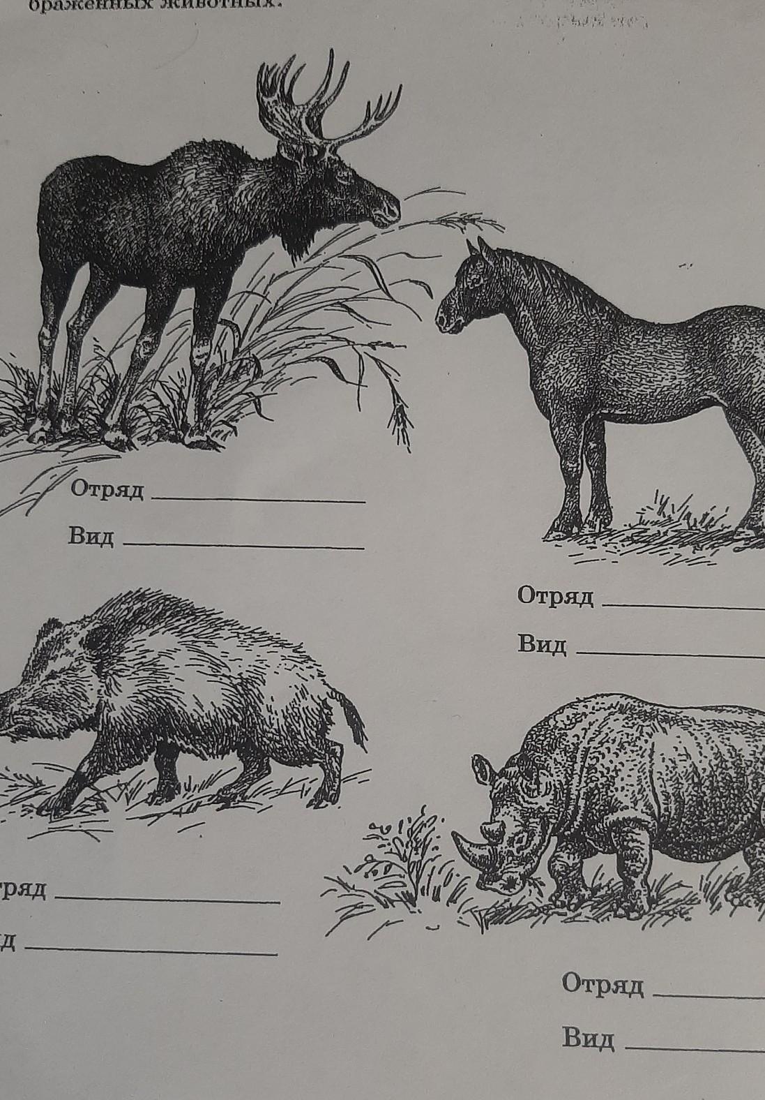 1. Вид лось обыкновенный. Отряд парнокопытные. 2 Вид лошадь Пржевальского. Отряд непарнокопытные. 3. Вид кабан или свинья дикая, отряд парнокопытные. 3. Вид черный носорог, отряд непарнокопытные.