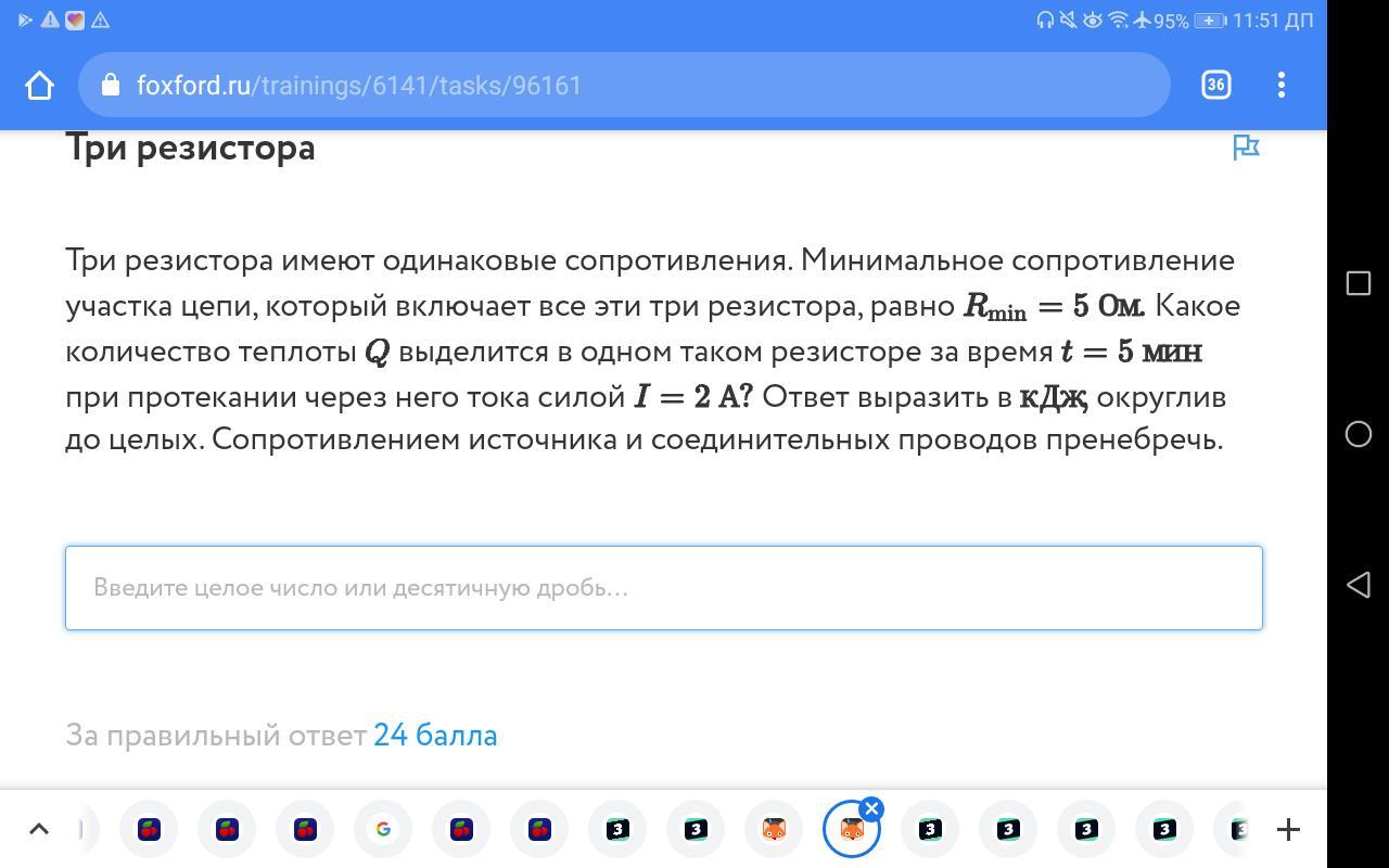 Минимально возможное сопротивление участка цепи, который включает три резистора, достигается при параллельном включении этих резисторов. Используя формулу для параллельного соединения сопротивлений, получаем: 1/Rmin=1/R+1/R+1/R=3/R, то есть Rmin=R/3 откуда R=15 Ом Согласно закону Джоуля–Ленца, Q=I²Rt=3²*15*600=81000Дж=81кДж t- время 10мин=600сек