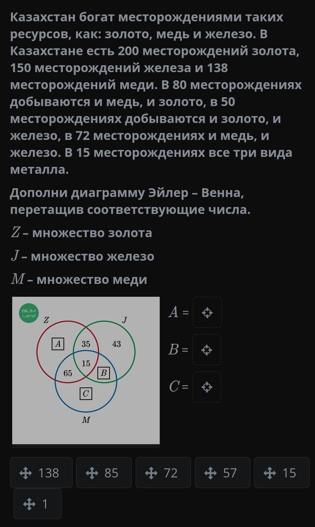 Дополни диаграмму Эйлер – Венна, перетащив соответствующие числа.