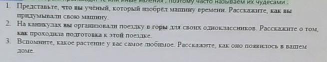 1. Представьте, что вы учёный, который изобрёл машину времени. Расскажите, как вы придумывали свою машину. 2. 2.На каникулах вы организовали поездку в горы для своих одноклассников. Расскажите о том, как проходила подготовка к этой поездке. 3. Вспомните, какое растение у вас самое любимое. Расскажите, как оно появилось в вашем доме