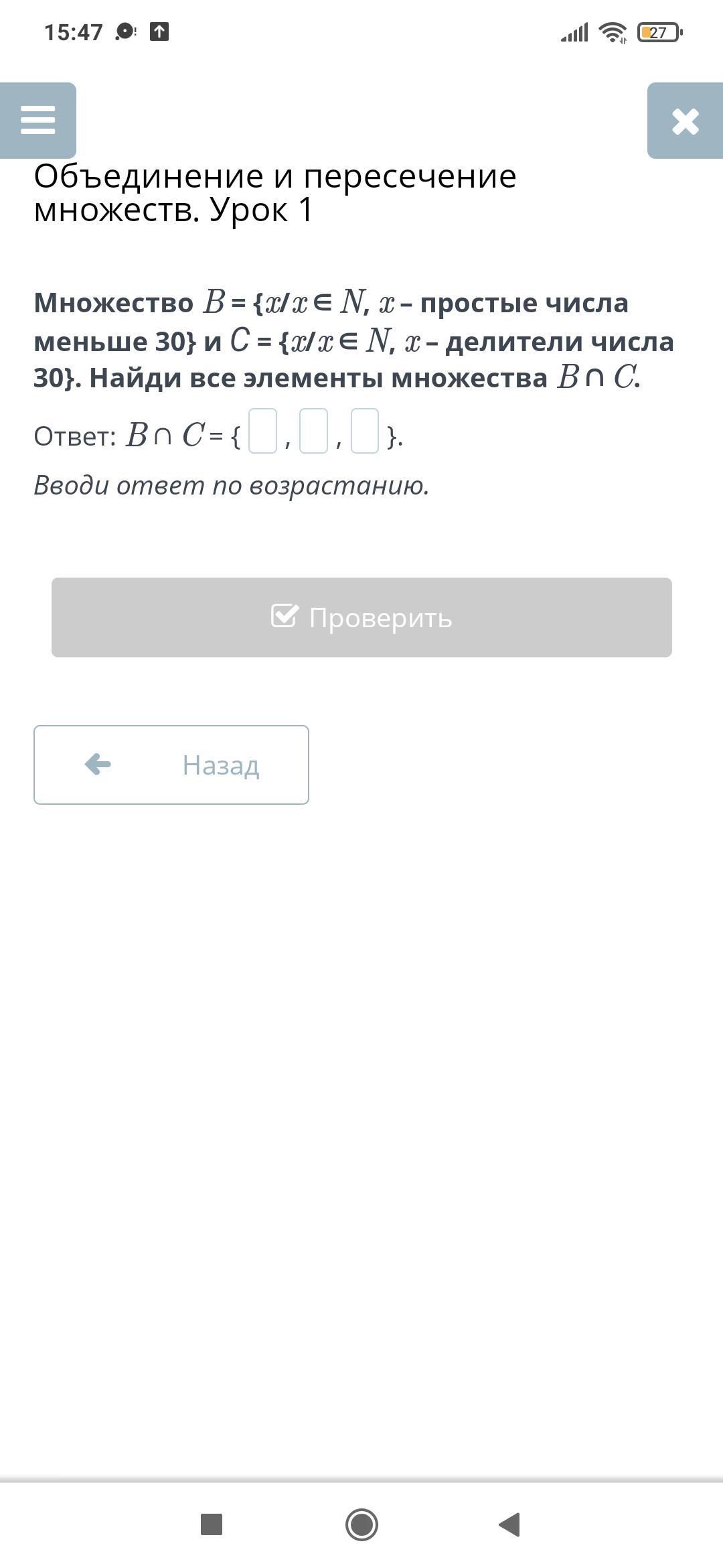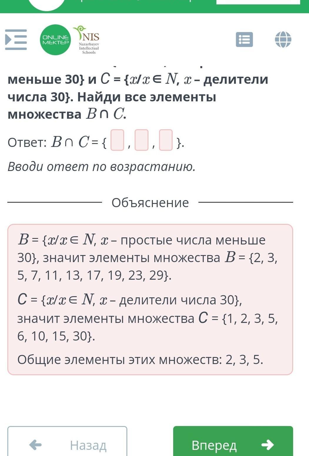 Множество B=\ x/x in N,x х– простые числа меньше 30} и C=\ x/x in N,x х- делители числа 30}. Найди все элементы множества В С. Ответ: о B cap C=\ Box, Box, Box\ Вводи ответ по возрастанию.