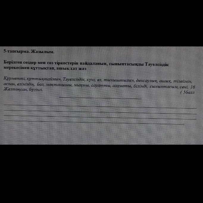 Құрметті сыныптасым!Бүгінгі Желтоқсанның 16-сы Тәуелсіздік күнімен құттықтаймын.Еліміздің мақтанышы,азаматы бол!Аспаның ашық болсн.Салауатты,білімді,мықты бол!Денсаулығың мықты,өмірің тыныш болсын!Әр күнімізді бірге өткізген жан сыныптасым!Бұйырса 11 ші сыныптыда бірге бітірерміз!Аман бол......