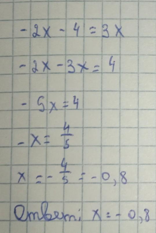 -2х-4=3х -2х-3х=4 -5х=4 5х=-4 х =-4/5 мину четыре пятых это корень уравнения